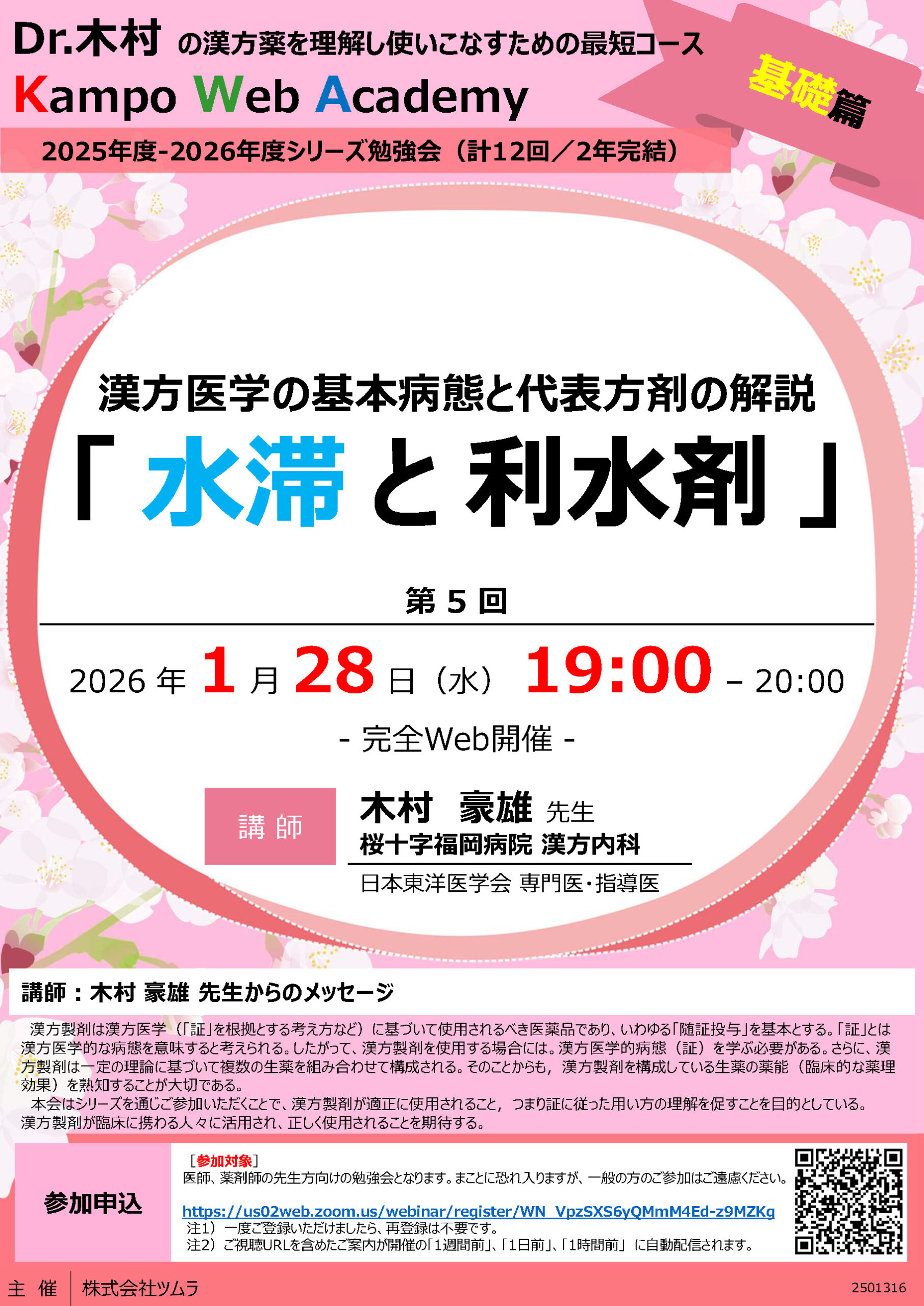 当院の漢方外来医師、木村先生が講師を務める、株式会社ツムラ主催「漢方ウェブアカデミー」(全12回)の第5回が2026年1月に開催されることになりました。