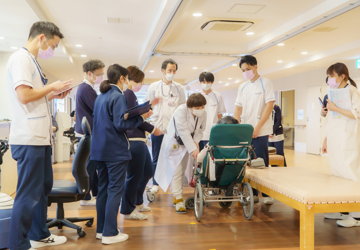 リハビリテーション科専門医、リハビリテーション専門職、看護師など患者さまを支える多職種の専門職が集まり、患者さまの症状に合わせた適切なリハビリを行います。