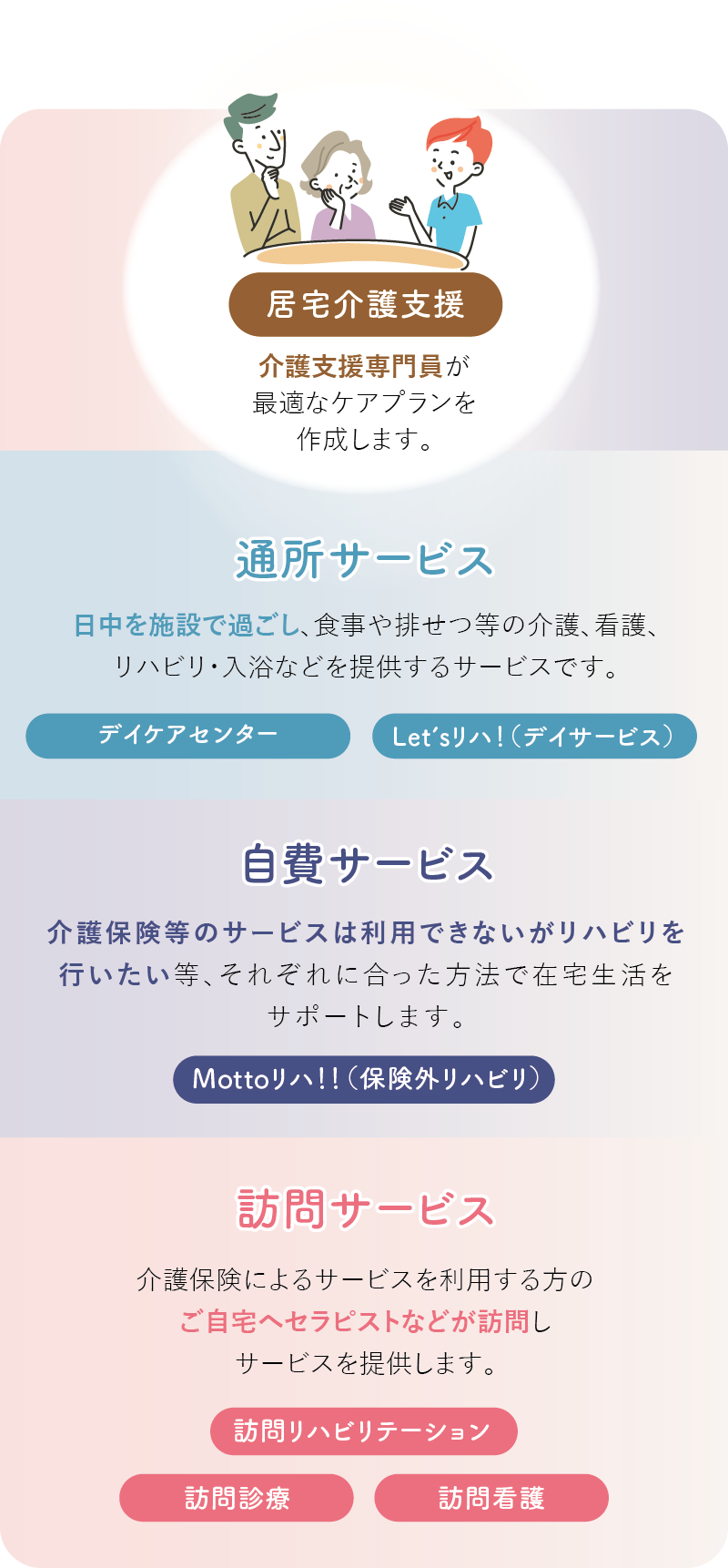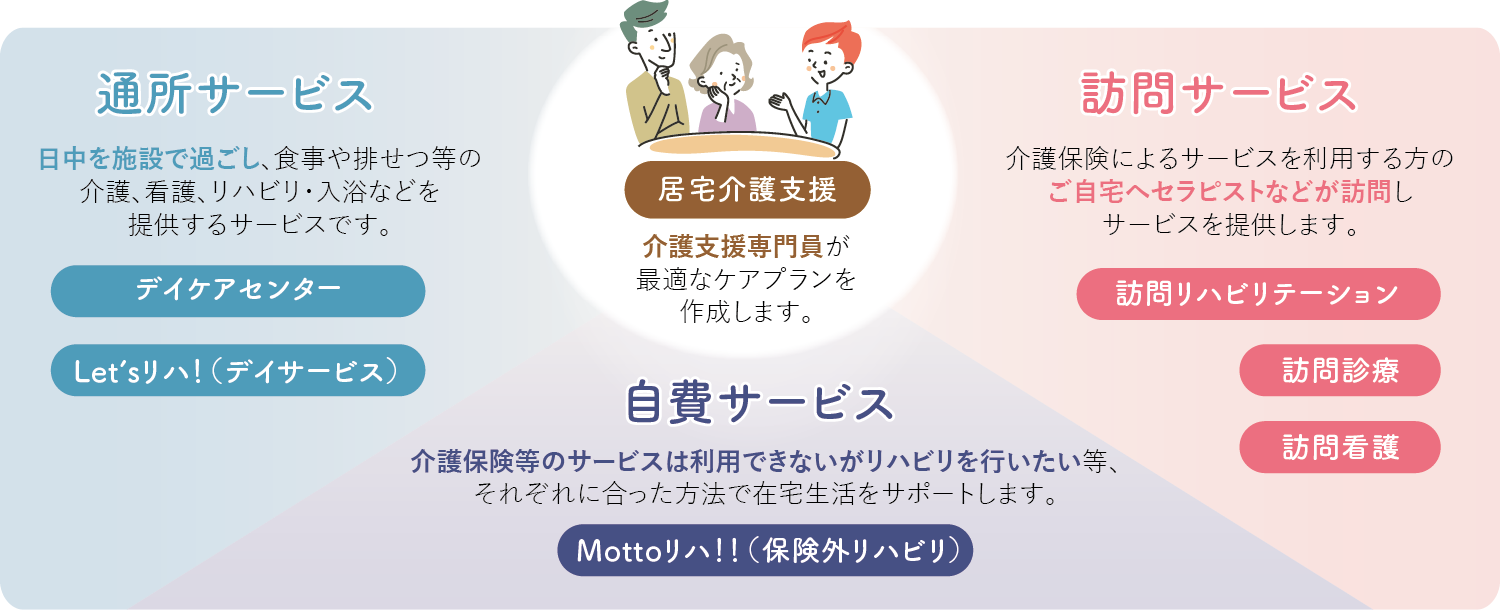 ご自宅で生活しなから受けられる様々なリハビリを組み合わせて、切れ目ないサポートを提供します。